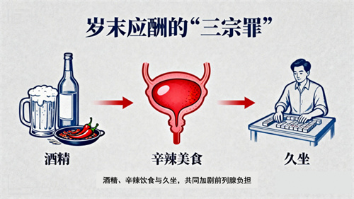 岁末年初的社交活动,往往为前列腺症状加重埋下三重隐患,它们分别是酒精、辛辣饮食和久坐。